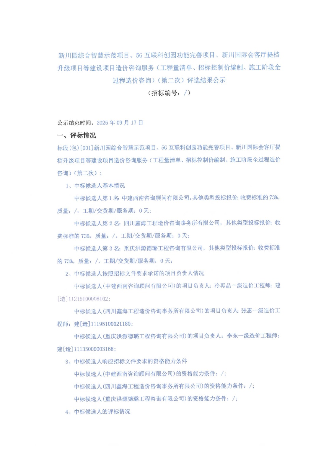 新川园综合智慧示范项目、5G互联科创园功能完善项目、新川国际会客厅提档升级项目等建设项目造价咨询服务(工程量清单、招标控制价编制、施工阶段全过程造价咨询)(第二次)评选结果公示