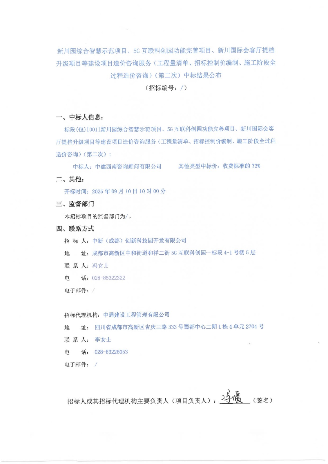 新川园综合智慧示范项目、5G互联科创园功能完善项目、新川国际会客厅提档升级项目等建设项目造价咨询服务(工程量清单、招标控制价编制、施工阶段全过程造价咨询)(第二次)中标结果公布