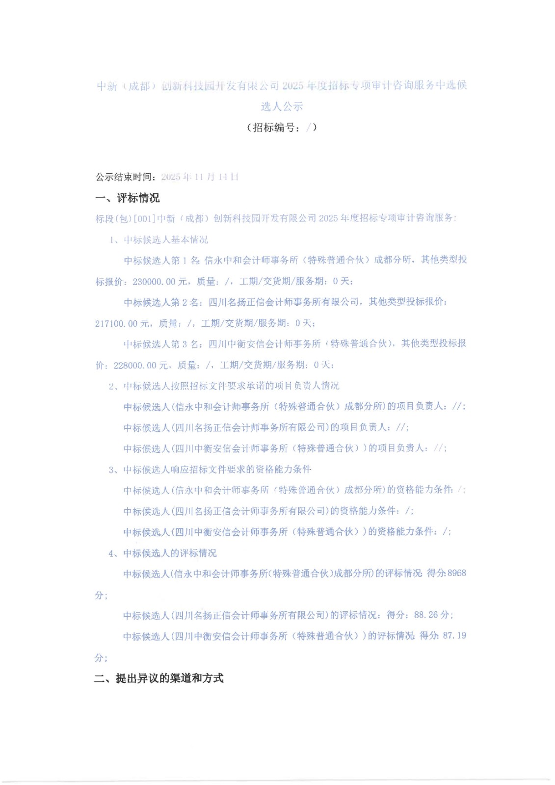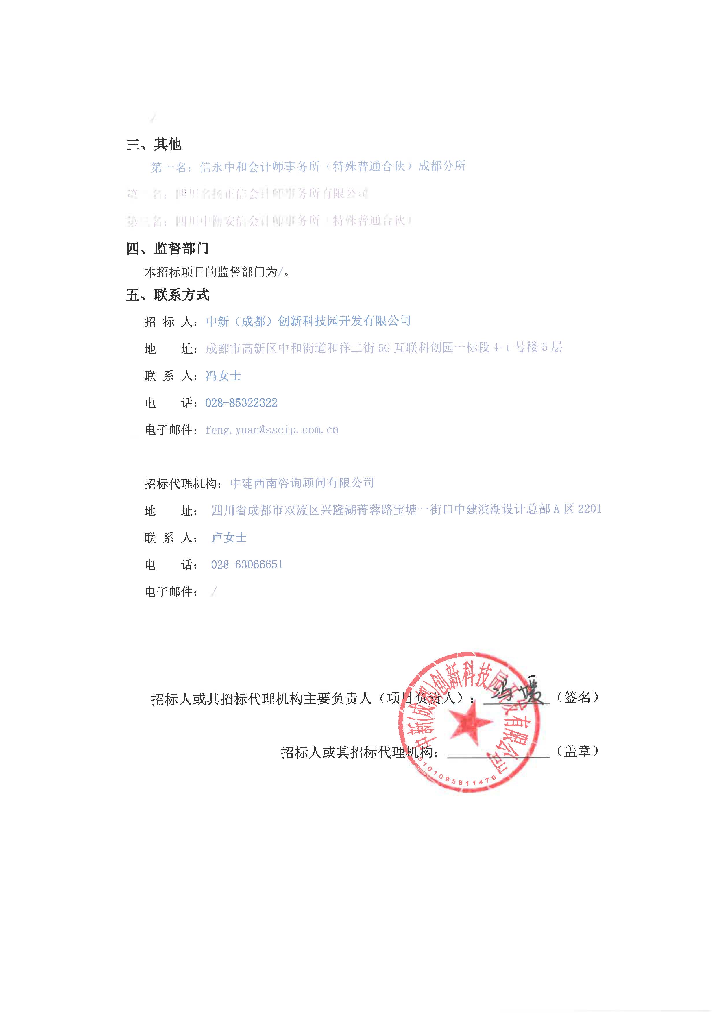 中新(成都)创新科技园开发有限公司2025年度招标专项审计咨询服务中选候选人公示